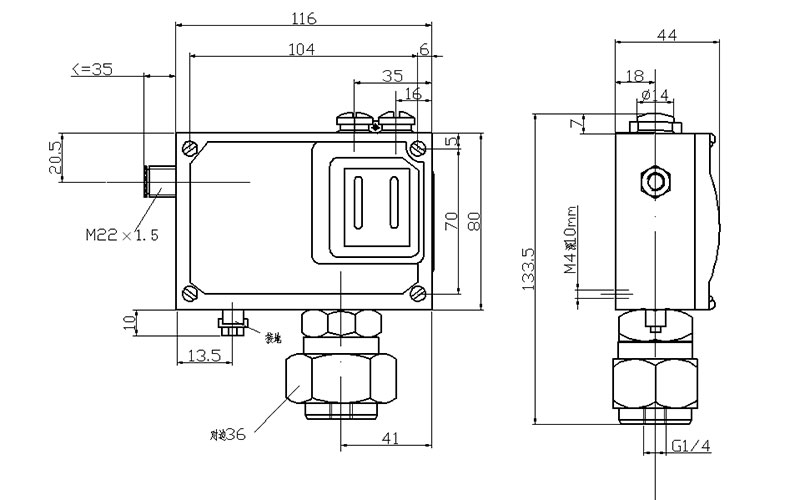 501/7D防爆壓力開(kāi)關(guān)外形尺寸及安裝尺寸(單位:mm)